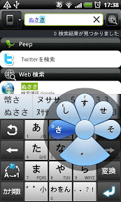 ATOK for Androidは、トグル入力と上図のような「フラワータッチ」と呼ばれるフリック入力での文字入力が可能です。またドコモの絵文字を内蔵しているとのこと。